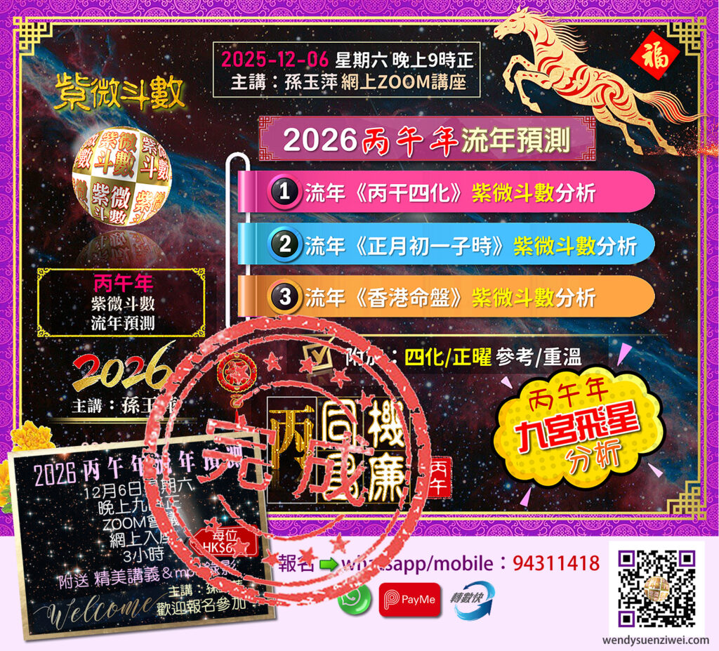 2026年《紫微斗數初班》第十八屆 已於2026-01-23 (星期五) 晚上9時正於網上ZOOM舉行,插班報名從速!