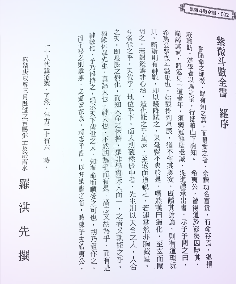 《紫微斗數全書》的【序】是明朝嘉靖年間狀元羅洪先所撰寫(見下圖)。在此文章中,他描述因得悉相傳陳希夷仙祖在華山山上得道成仙,因此專程登上華山巔峰拜訪。在仙祖的祠堂內偶遇其後人,並獲贈秘藏的《紫微斗數全書》原創版,以下是此【序】的白話文翻譯: